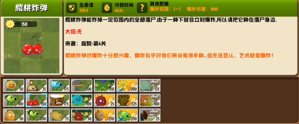 樱桃炸弹:种下后会立刻引爆,能清除一定区域内的全部僵尸。