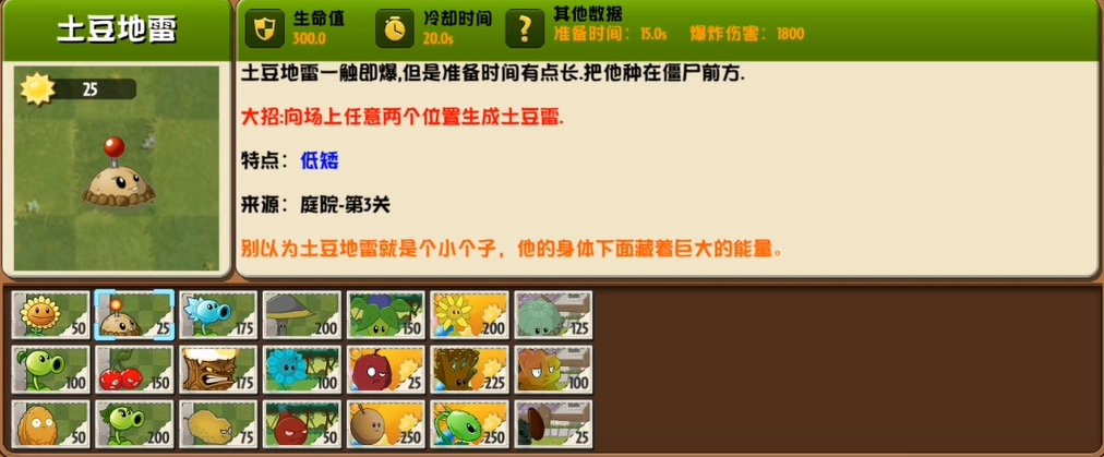 土豆地雷:种下之后得等它慢慢长成,长成以后只要有僵尸碰到就会立刻爆炸。要是放大招的话,就能在场上随便哪个地方生成土豆雷啦。