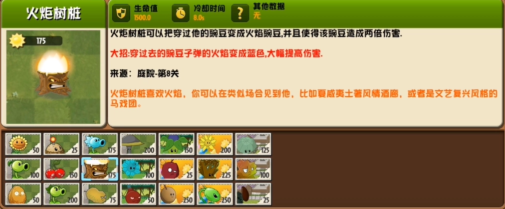 火炬树桩的能力是让经过它的豌豆转化为火焰豌豆,同时使这些豌豆的伤害提升至原来的两倍。当它释放大招时,穿过的豌豆子弹所附带的火焰会变为蓝色,其伤害也会得到显著增强。