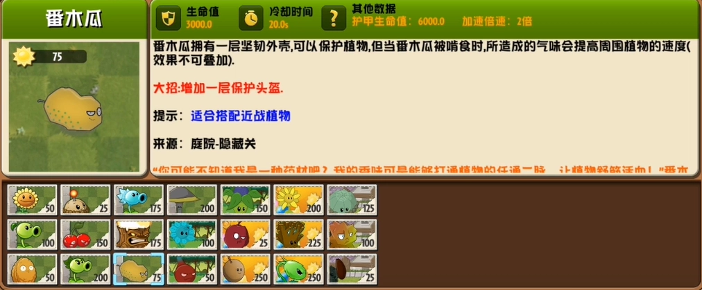 番木瓜有着坚韧的外壳,能起到保护自身的作用。不过,一旦它遭到啃食,散发出来的气味会让周围植物的速度有所提升(此效果无法叠加)。它的大招是额外生成一层防护头盔。
