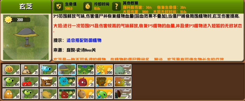 玄芝的技能机制如下:它能在3×3的范围内释放气味,既能对僵尸造成伤害,也能为范围内的植物恢复生命值(需注意回血效果无法叠加);若有僵尸啃食其周围的植物,玄芝的伤害会相应提升。而它的大招效果更为强劲:会进行一次5×5范围的气味释放,不仅伤害更高,还能恢复该范围内植物的血量,同时让其中3×3区域内的植物进入短暂的无敌状态。