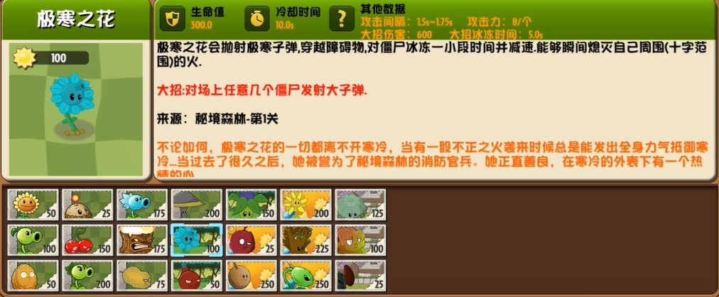 极寒之花:它会发射极寒子弹,这种子弹可穿透障碍物,击中僵尸后能使其短暂冰冻并减速,还能立刻扑灭自身周围十字范围内的火焰。大招效果是向场上随机几只僵尸发射大型子弹。