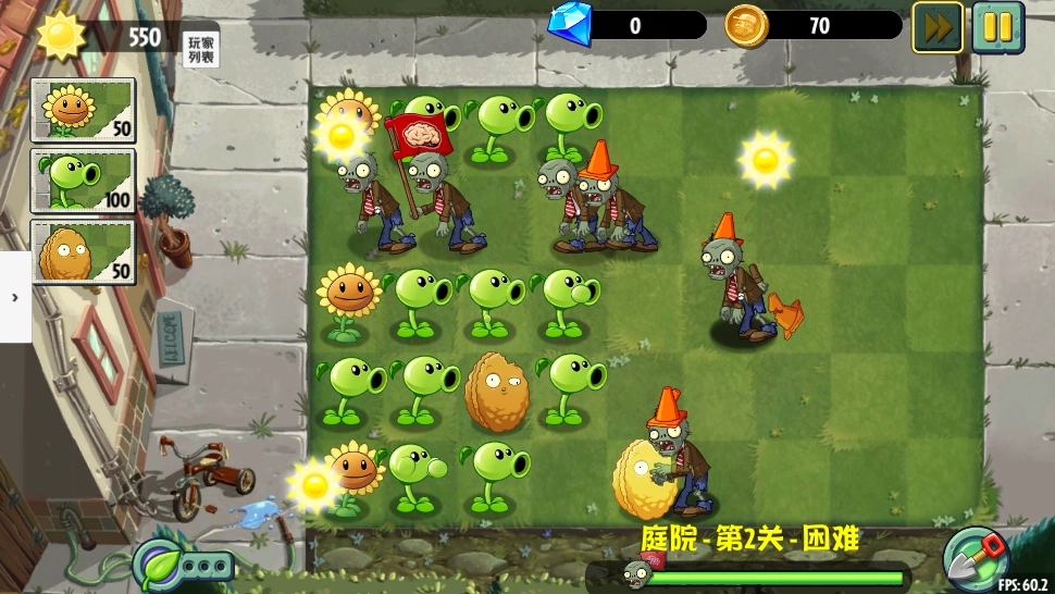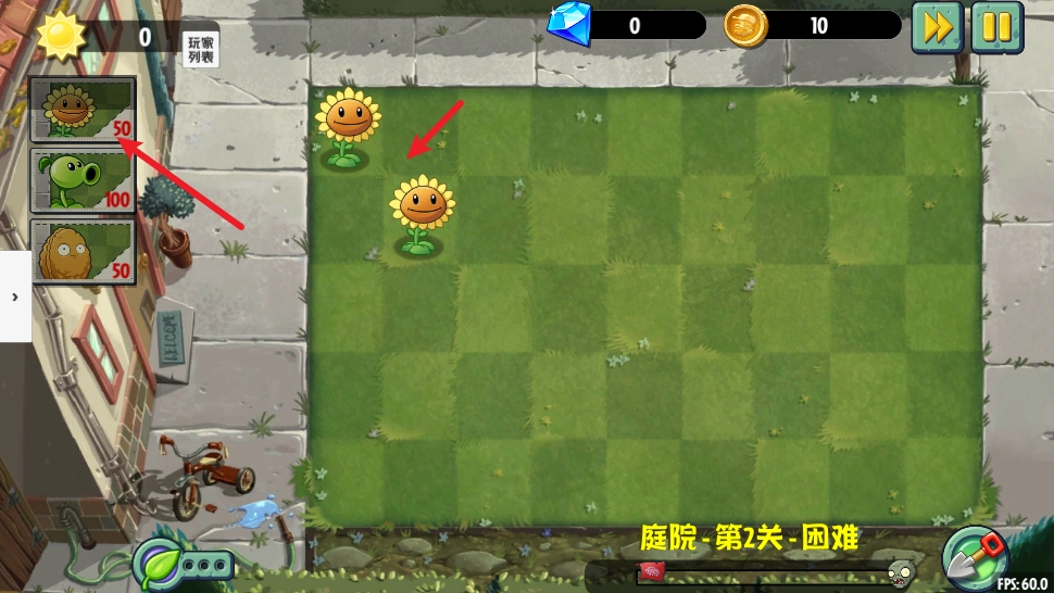 进入游戏后,我们得先种上各类向日葵,这样才能确保有足够的阳光供应。