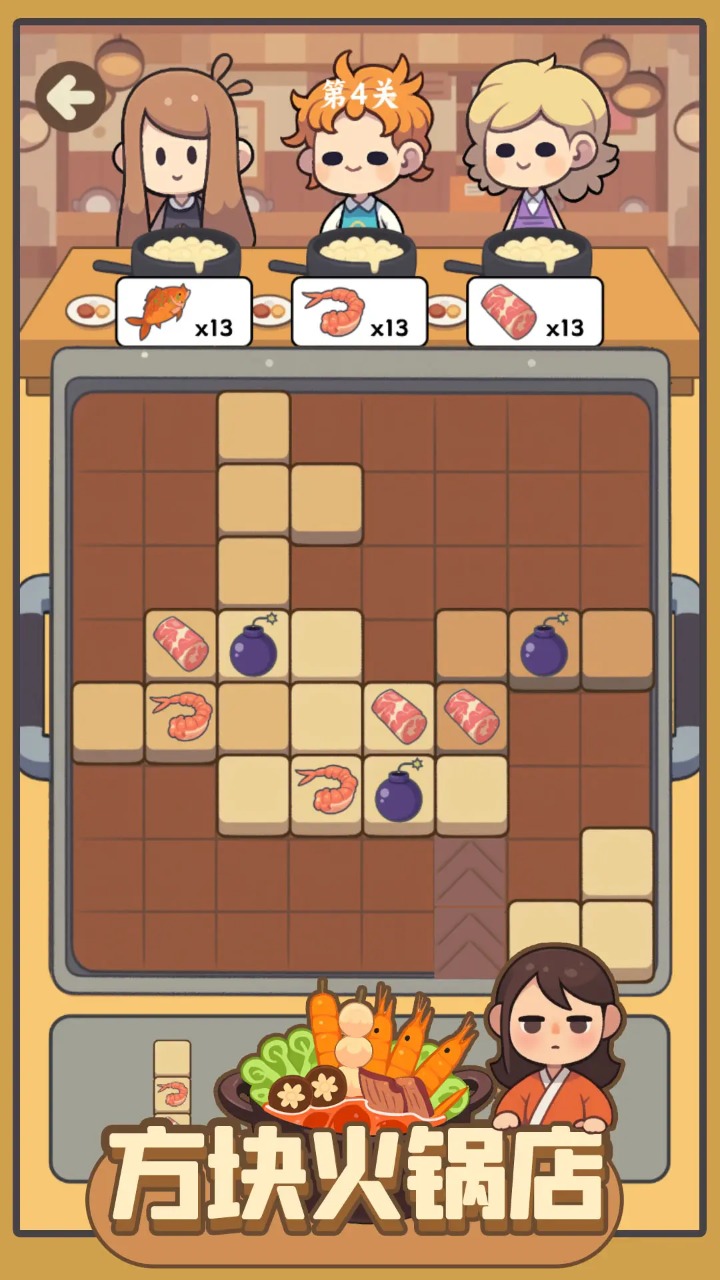 一款食材方块消除的休闲经营类手游。玩家化身火锅店老板,简陋的九宫格锅底进行食材的消除获取,通过拖动肥牛卷、虾滑、土豆片食材方块,在网格中完成消除,消除的食材会直接飞入顾客锅中,满足需求赚取金币与食材奖励。