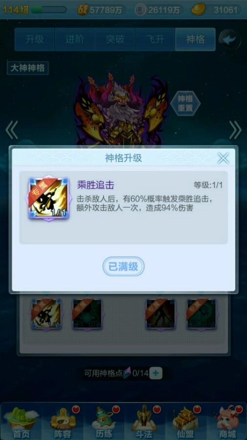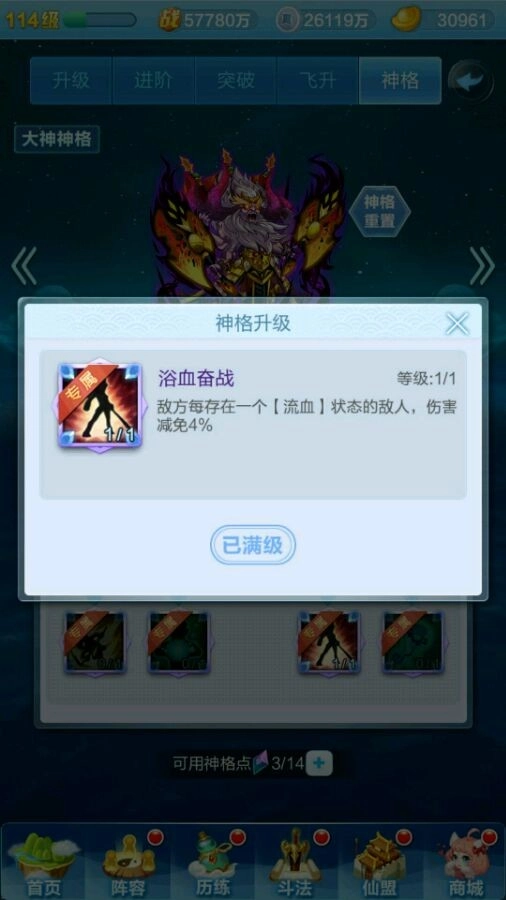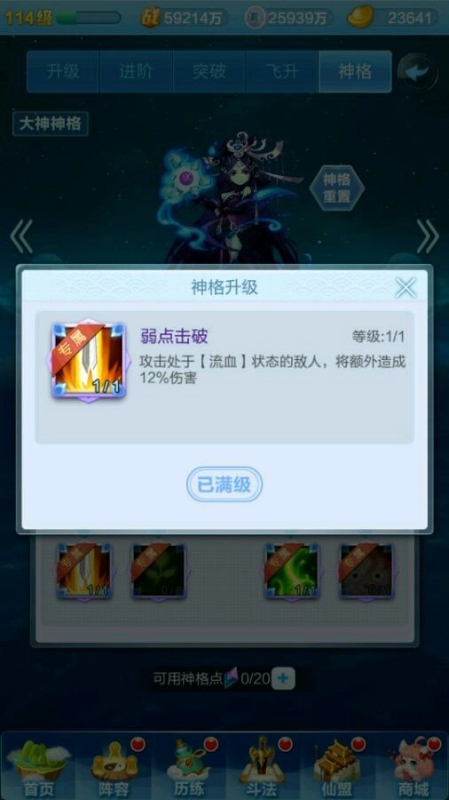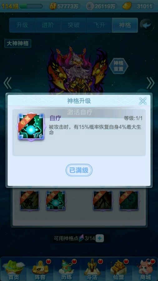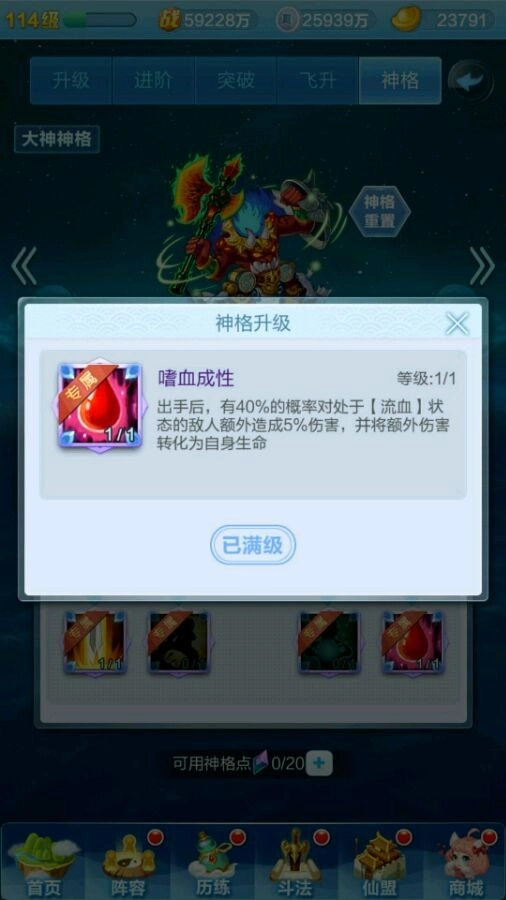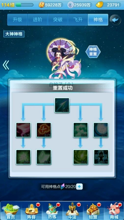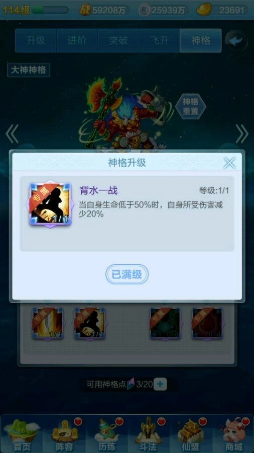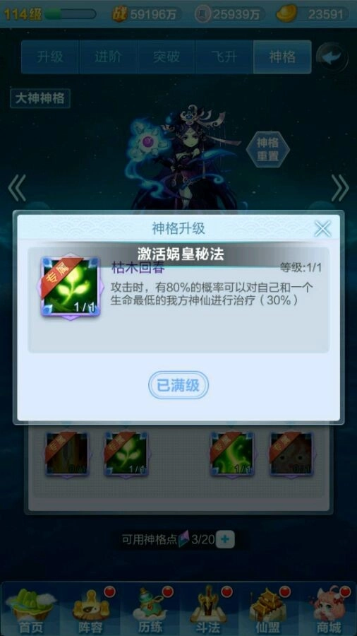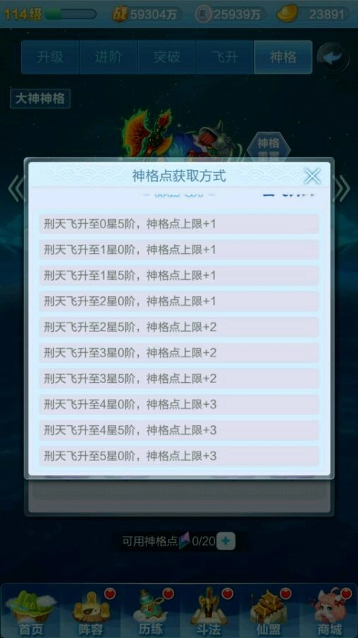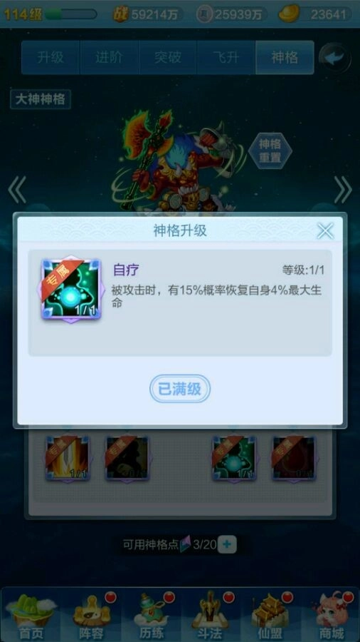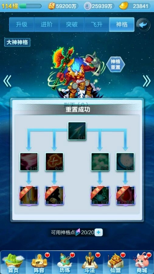 先给大家介绍一下神格系统的基础构成:每个神仙都拥有专属的神格体系,包含九个可选择的技能,设计上类似天赋树机制。其中红色品质的神仙具备4个专属天赋,橙色品质的神仙则共享相同的神格天赋内容。每位神仙最多可分配20个天赋点用于解锁技能,这些天赋点需通过飞升玩法获取(参考下图展示)。