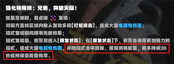 在新版本中,安东的【爆发状态】有了显著增强:进入该状态后,能量不再随时间流逝消耗,状态持续时长也达到了30秒。这意味着他在输出过程中能更灵活地进行切人和闪避操作,对安东而言,这无疑是一次质变级的调整。