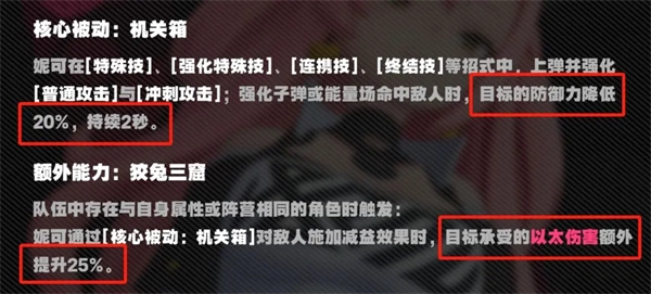 新版里妮可的核心被动调整为减防效果,1级核心技就自带20%的减防比例,随着等级提升数值会变得很可观,她可以灵活加入队伍充当聚怪兼减防的辅助角色,这让妮可的泛用性得到了大幅增强。要是和以太系主C组队,还能额外提供25%的以太易伤加成,尽管目前暂时没有其他以太角色,但从整体来看,她的功能性已经有了明显的提升。
