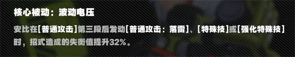安比的核心被动同样迎来显著强化,1级时核心级落雷与E/强化E技能带来的失衡值提升效果,从原先的6.3%上调至32%,实战中的失衡效率极为出色,是游戏前中期相当优质的击破手,单看击破效率足以媲美5星角色。