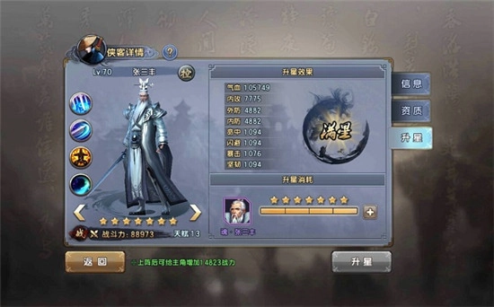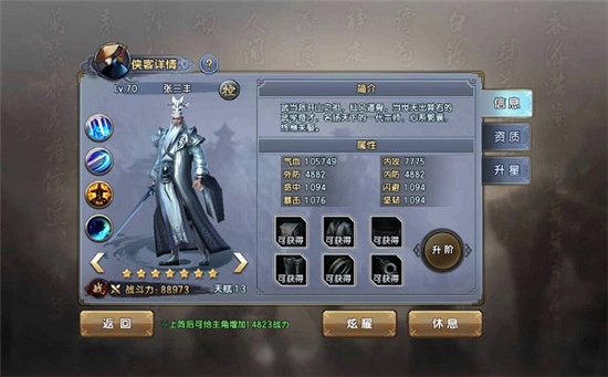 玩家在副本里能获取不少侠客装备,打开侠客界面就能把这些装备给侠客穿上。等侠客凑齐一整套装备时,就能给侠客升阶了。升阶后的侠客,属性加成会更强。培养侠客得用资质丹,资质丹可以从日常副本和抽奖活动里得到。侠客吃了资质丹,自身的属性会有很大提升。