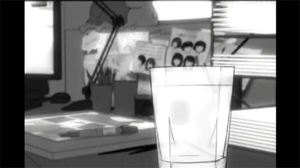 》(倒水)[可能杯子旁有马克笔;墙上头像]杯子