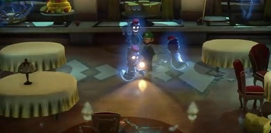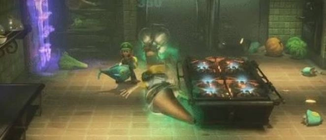 第二层关卡也没什么复杂的地方,boss战开始前,先和傀路易吉一起用吸尘器把场地的烟雾清理干净。接下来的厨师boss,得利用场地里的一些投掷物,先击中它让它出现硬直,之后就能照射吸取了。