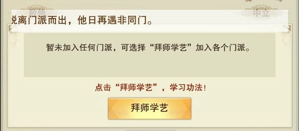 当玩家尚未加入任何门派时,会处于“散修”状态,此时点击“拜师学艺”按钮,系统便会依据玩家当前的修为,随机将其分配至各大门派中。