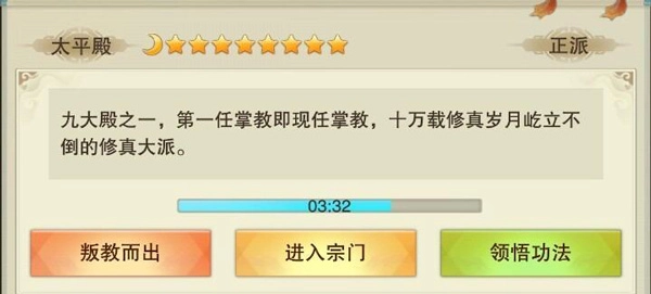 点击“叛教而出”选项,系统会依据当前门派的等级扣减相应声望,让玩家恢复到无门派的散修身份,这样就能重新选择想加入的门派。等在当前门派学完所有攻防技能和秘诀后,就可以叛教离开,继续去刷下一个门派——对玩家而言,门派更像达成目标的工具,目的达成后便可舍弃。当把当前境界能加入的所有门派都“毕业”(学完核心内容)后,通常会选一个有炼丹术的门派停留,专门挂丹方,为下一轮刷门派做准备。