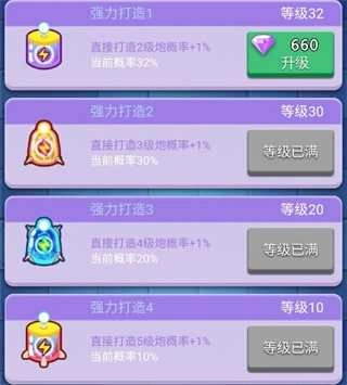 钻石的主要开销集中在优先把强力打造升满,等这个搞定了再考虑其他方面。就像图里展示的,先把这四个强力打造都升到10级,之后再按照3-2-1的顺序依次升满。
