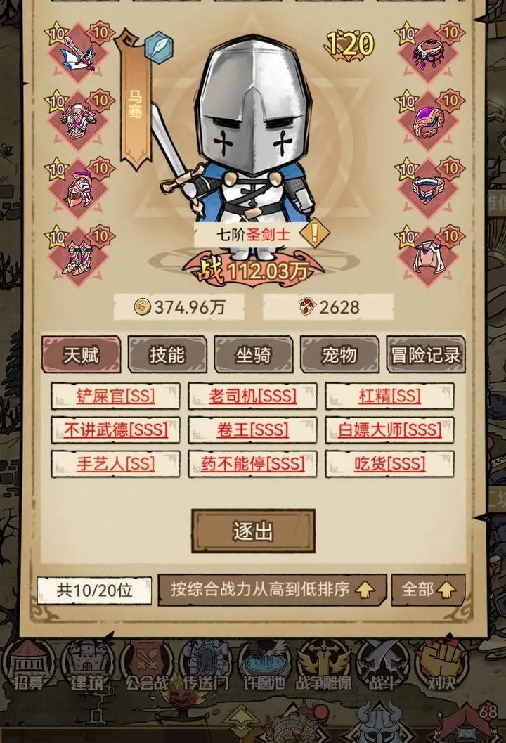 等10个英雄全部达到满级,并且他们的骑宠装备都升满星、强化到最高等级后,再去开启传送门所在的城镇,着手学习技能。等所有技能都掌握之后,就用进击模式把相关内容刷满。