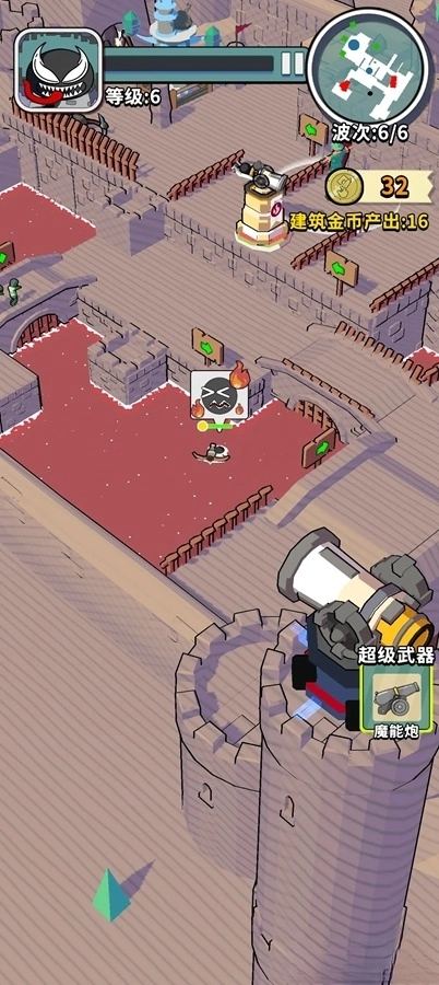 前期游玩建议:开局优先把金矿造满,升级一级基地后每回合能多赚4收益,所有角色最好都能单独应对前两波小怪,尽早让收益滚起来,搭配经济类词条会轻松不少(金色词条选寻宝,6元弩;紫色词条选狩猎)。角色的仇恨优先级比较高,要学会拉扯风筝像大胖子这类的怪物。