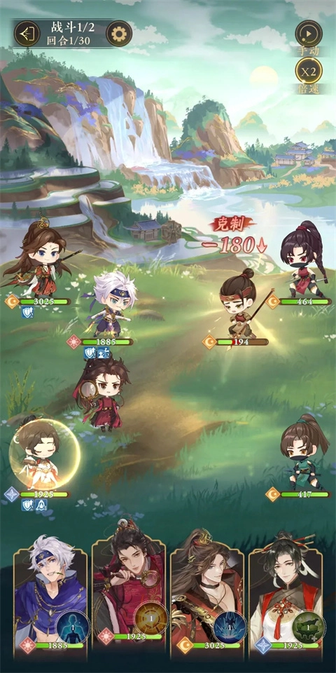 释放角色技能,持续消耗对手的生命值,直至将他们全部消灭。
