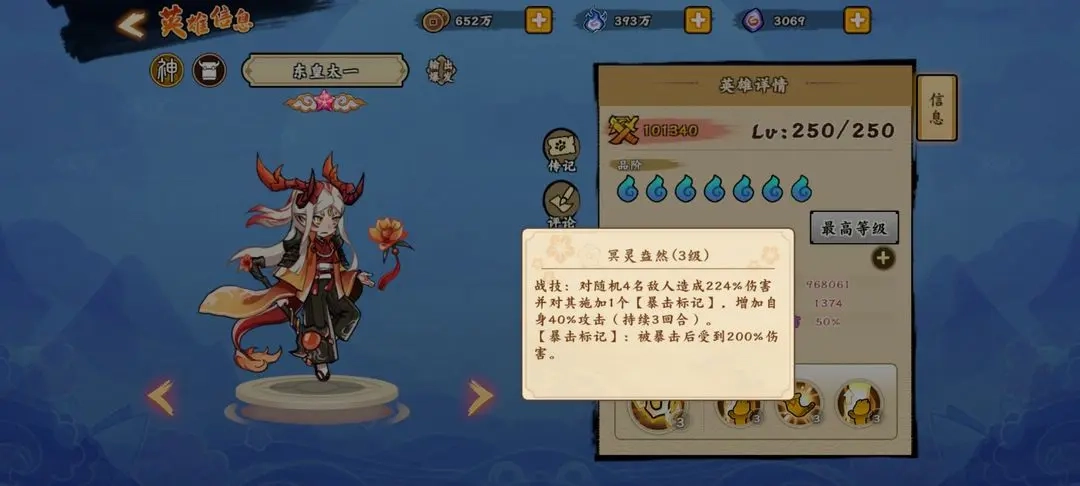 大招冥灵焉然的效果是给敌人上暴击印记,带印记的敌人被暴击时会承受200%的伤害。要是和貂蝉组队就很厉害——貂蝉的暴击率靠技能加成能到60%,而且这个大招的被动还能给自己加35%暴击率,被攻击的时候还会给所有敌人都挂上暴击印记。这种强强组合下,只要你有高星级的东皇和貂蝉,在游戏里基本就能畅行无阻了。