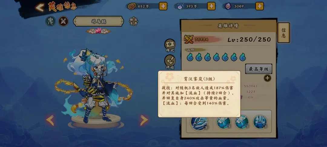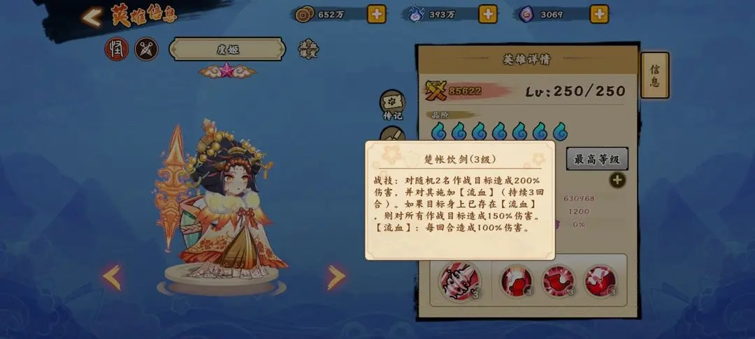 大招楚帐饮剑:对敌人施加流血效果,若目标已处于流血状态,则触发对全体敌人的伤害,等同于额外附加两次群体攻击;被动效果为提升对流血敌人的伤害,并恢复自身生命值。