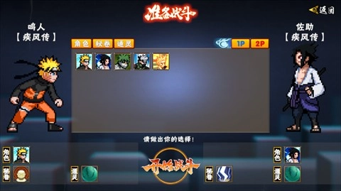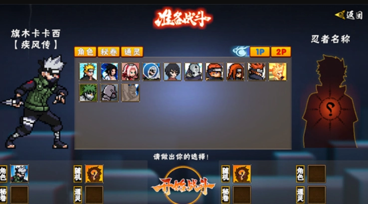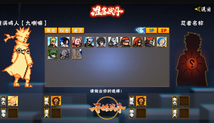 对战模式选择完成后,会进入【准备战斗】界面。在这个界面里,双方都能挑选忍者角色、秘卷以及通灵,操作方式和旧版相同,只需点击对应的图片就行(1P代表玩家自己,2P代表对手)。等所有准备工作都做好了,点击下方的【开始战斗】按钮就可以了。