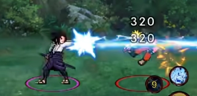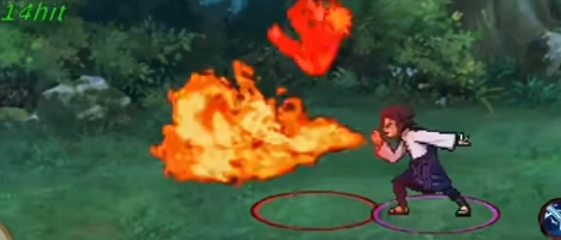 普攻共有五段动作:第一段是拳击,第二段用刀顶击后抽刀后撤,第三段位移并进行斩击,第四段为飞踢,第五段则释放火遁完成终结。
