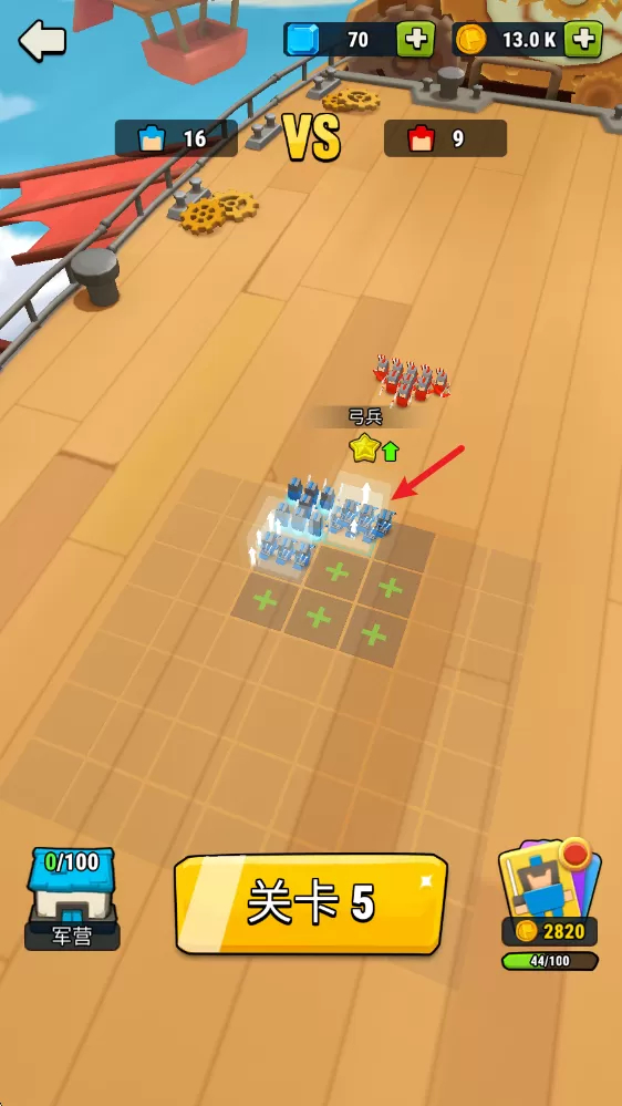 2、相同类型和等级的士兵可以拖动到一起合成。