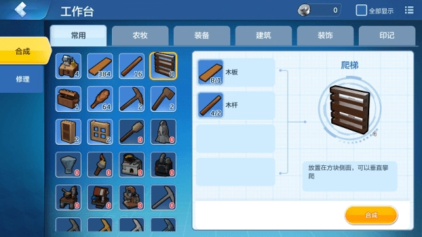 爬梯的制作方法十分简易,无论是在工作台还是背包的合成栏中都能进行制作,只需要用到砍伐树木得到的木块合成物——1块木板和2根木杆就可以了。