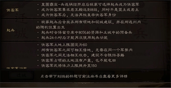 在地图上只要是黑颜色的领土都是侠客军的范围