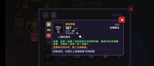 湛蓝军帽:这件头部装备同样只能从96层以上秘境掉落的箱子中开出,它的特效名为冰爆——当击败处于冰缓状态的敌人时,会将其引爆,造成相当于武器伤害590%的伤害,同时附加冰冻与冰缓效果。
