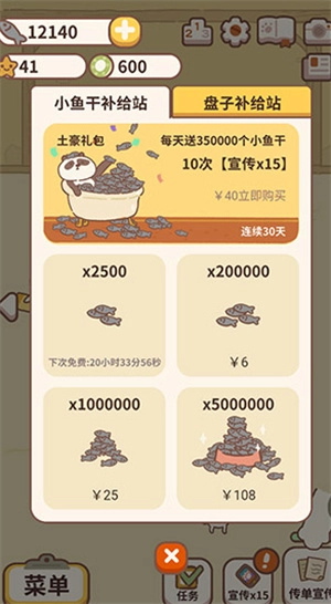 要是购买物品时鱼干数量不足,系统会给出提示,你可以选择观看15秒广告来直接补齐所需鱼干,这样就能自动买下该物品了,不过每天观看广告的次数是有限制的。