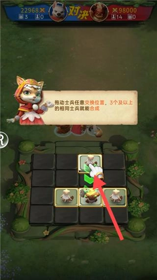 进入游戏后,在界面上拖动士兵来交换他们的位置,只要有3个或3个以上相同的士兵连在一起,就能完成合成操作。