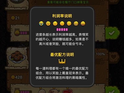 出发前可以点击[开始探险]左侧的按钮,查看图鉴并确认当前地图怪物的组合形态。要是探险途中忘记了也不用担心,捕捉怪物时点击右上角的图案,就能随时查看该怪物的形状。餐厅满意度务必保持在60以上!可以制作单一的美观菜品,确保满意度趋势为正。在满意度趋势是正数的前提下,预估收益自然是越高越好。要是黑暗料理王的餐厅库存满了该怎么处理呢?一种情况可能是长时间未上线,导致顾客都走光了,这种情况下可以先把锅停掉,等一会儿再继续制作;另一种情况可能是顾客满意度低于60%,使得食物卖不出去或者卖得很慢,从而造成库存堆积,要是这种情况,就只能留一个锅做饭团来提升满意度,其他的锅先进行升级操作!