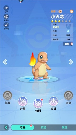 在培训系统里,能看到觉醒、升星、特训、突破、潜能这些用于提升精灵实力的功能模块。