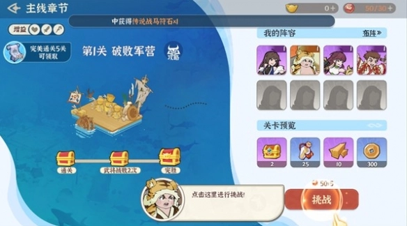 完美通关可领取增益奖励,不同通关结果(普通通关、武将战败2次、完胜)对应的宝箱会提供不同资源。