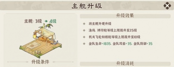 由于游戏的背景设定在海上漂流,战船实际上就等同于我们的主城。玩家最初只有一艘小小的木筏,需要通过收集材料逐步升级,把它打造成一艘规模宏大的战船。在这个过程中,战船的外观会随之改变,让玩家获得强烈的经营体验。此外,战船内部设有粮仓、历练、军团等多种功能,解锁和升级这些功能所需消耗的资源主要是主舰经验等基础资源。