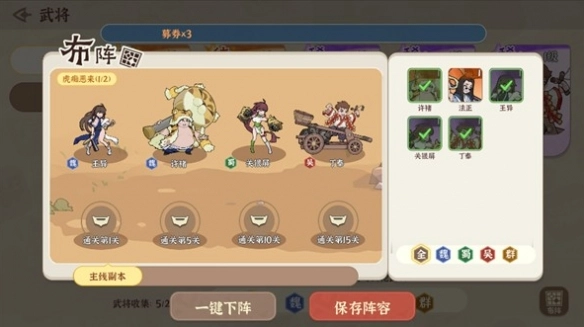 根据武将所属阵营和技能特性来搭配阵容,选好阵容后点击“保存阵容”;通关相应关卡即可解锁新的武将上阵位置。