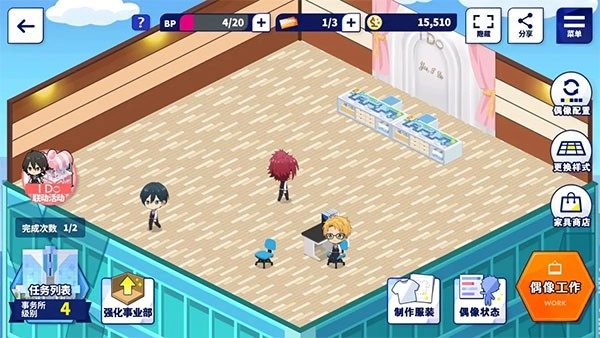 要是大家想给自家喜欢的小偶像做衣服、布置房间,那就得常打开事务所啦。等事务所升到2级后,各项功能才会解锁开放。