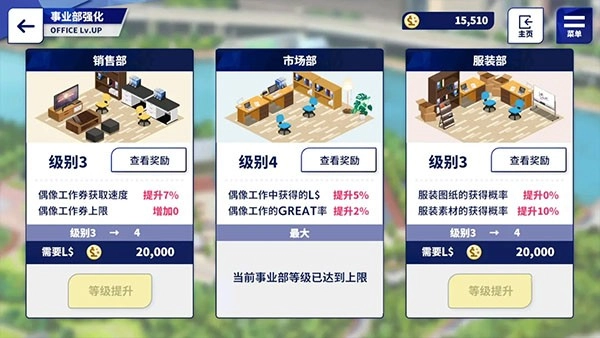 市场部是我优先考虑升级的部门,从界面上能看到,它的等级越高,在工作时触发“great”评价的几率就越大,相应获得的金币数量也会更多。要知道金币可是购买家具和升级事业部的关键资源,要是想布置房间却没有足够的金币,那也只能是空想!