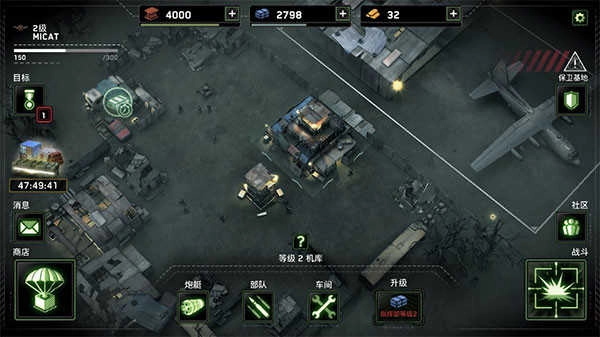 开始执行任务后,首先要确定「部队部署」的位置——红圈标注的高塔区域禁止部署。建议先观察「可掠夺资源」周边的建筑布局,计算各障碍物与资源点的距离,同时明确任务目标的具体要求,尽量达成目标以获取更多资源。前期任务难度较低,完成后获得的宝箱有机会开出5.56毫米机枪、MP5冲锋枪、火炮等装备,以及等级经验。点击「战队图标」可查看所有武器和设施,其中红色标识代表尚未获得的内容。