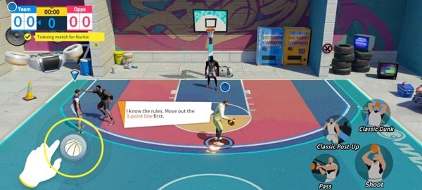 在比赛界面中,左下角的区域用于控制角色移动,右下角的区域则可进行传球、投篮等操作。
