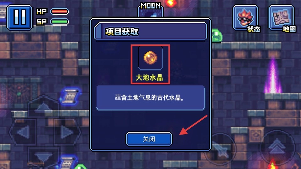 获取【大地水晶】后,点击【关闭】按钮,继续在地下城中进行探索,利用道具来推动剧情发展。