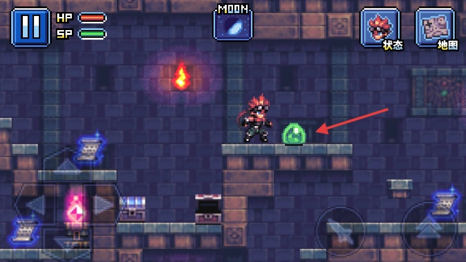 当角色靠近绿色的可交互物体时,操控角色移动过去,通过点击攻击键或技能键来触发互动,以此收集物品或击败目标,推动冒险进程向前发展。