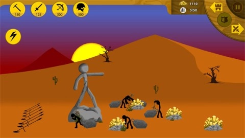 战斗刚开始的时候,点击左上角的按钮就能召唤不同的兵种啦。要记住哦,只有矿工可以采矿,采到的黄金是用来召唤其他兵种的,所以合理利用资源特别重要!