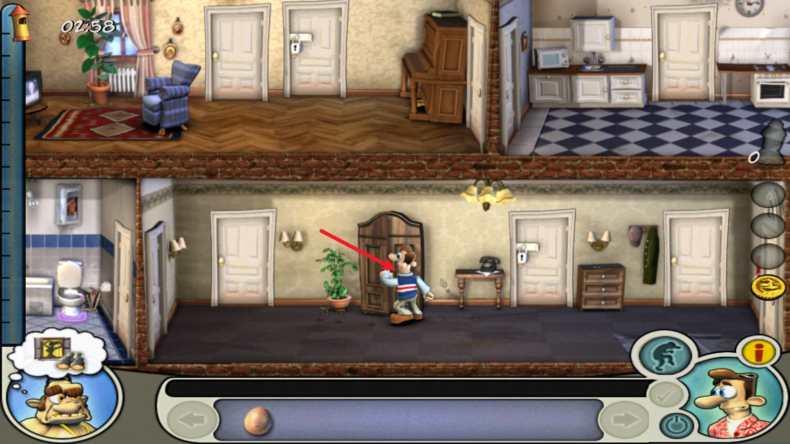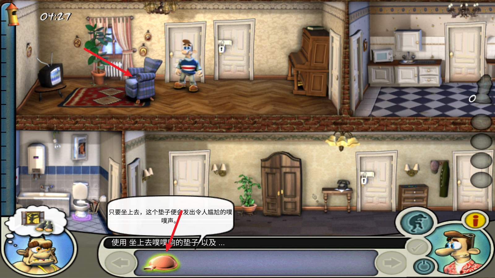 找到道具后,我们得把它放在合适的地方来搞整蛊,而且必须趁邻居离开某个房间的时候动手。