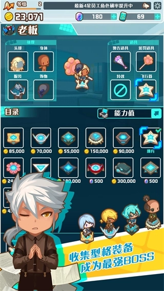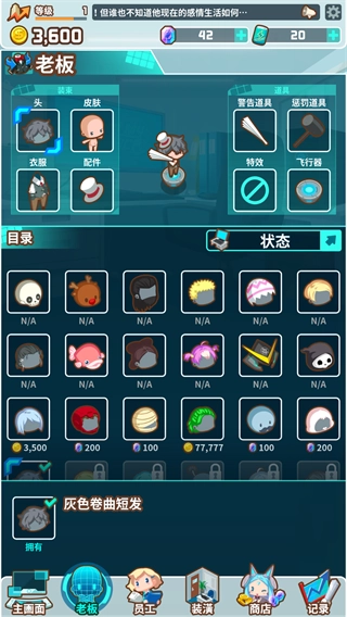 在老板界面里,你能给老板搭配各式各样的装扮,也能为其配备各类警告道具。不过要注意,这些道具都得用金币兑换,你得先攒够足够的金币才能获取它们。