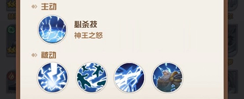 神王之怒:宙斯引动神雷之力,向大范围区域内的敌人发起3波攻击,每一波都能造成相当于自身攻击力10%的魔法伤害,同时有1%的概率使敌人陷入眩晕状态,并削减其2%的魔法防御。该技能释放后,宙斯的攻击速度会提升15%,此效果最多可叠加3层。