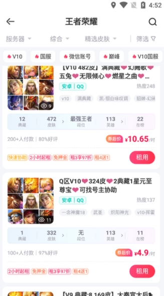 例如进入“王者荣耀”的账号页面,依据服务器、皮肤等条件对账号展开筛选。