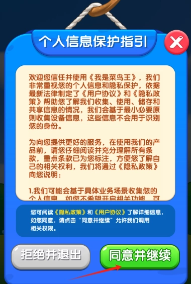 安装并打开我是菜鸟王游戏,点击同意并继续