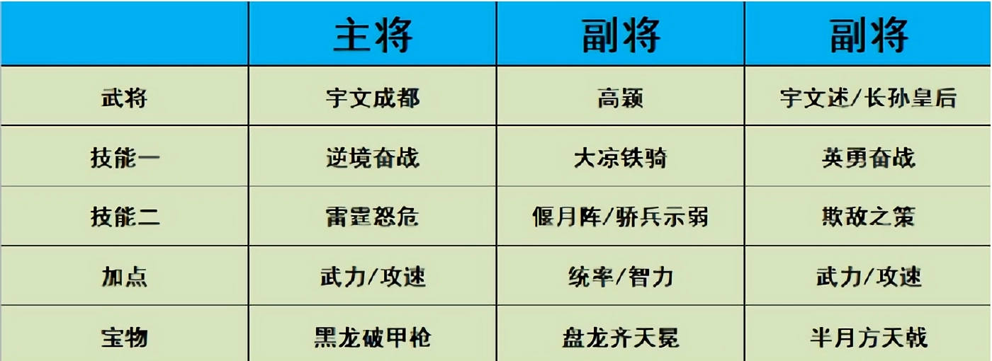 爆头骑的核心输出和功能依赖宇文成都与高颖两位武将:宇文成都具备高概率锁定敌方主将的特性,高颖则能为我方主将提供持续2回合的免控效果与50%减伤加成,因此队伍的主要培养资源应优先倾斜给宇文成都。由于该队伍缺乏续航能力,战斗完全依靠锁头机制打爆发,对技能配置的要求较高,导致前期强度较低、表现不佳;若选择玩这个队伍,需要先“摆烂”发育半个月,等养度提升后,才能逐渐具备与三李队抗衡的能力,直到阵容满配后,对阵三李队的胜率大概能达到三七开。至于副将的选择,宇文述和长孙皇后都是可行的,两者的作用都是提升队伍的先手能力,不过个人更倾向于长孙皇后,她的技能机制与爆头队的核心思路契合度更高。