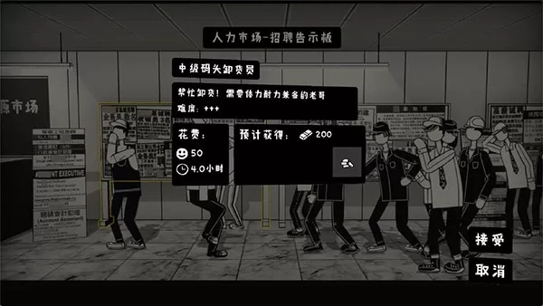 在游戏里,玩家能够一头扎进人才市场,通过打工来赚取金钱。